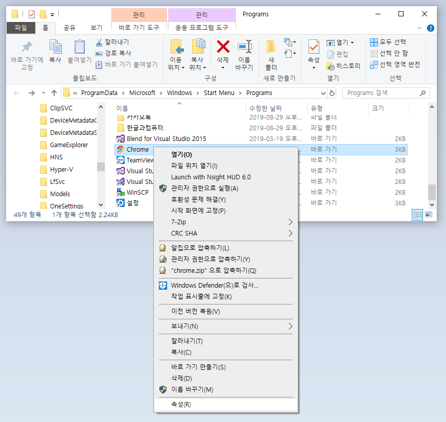 크롬 아이콘에 오른쪽 클릭으로 속성을 엽니다.
