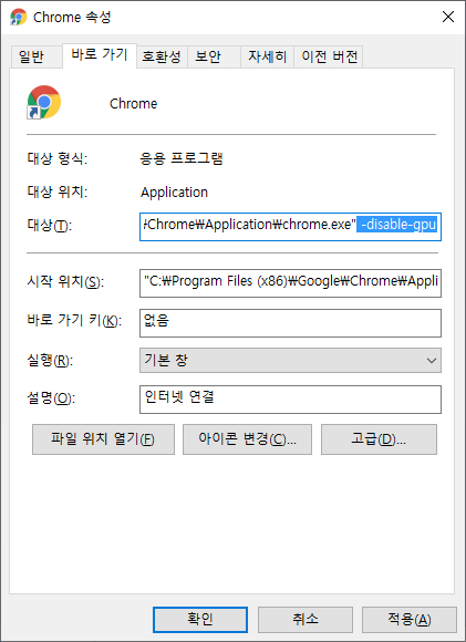 그럼 아래와 같은 창이 뜨는데 대상 뒷부분(~chrome.exe" 뒷부분)에 아래와 같이 -disable-gpu를 추가해줍시다.