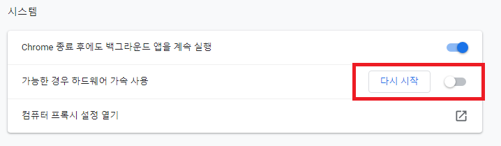 그리고 아래 이미지와 같이 가능한 경우 하드웨어 가속 사용을 꺼 주시고 다시 시작을 합니다.