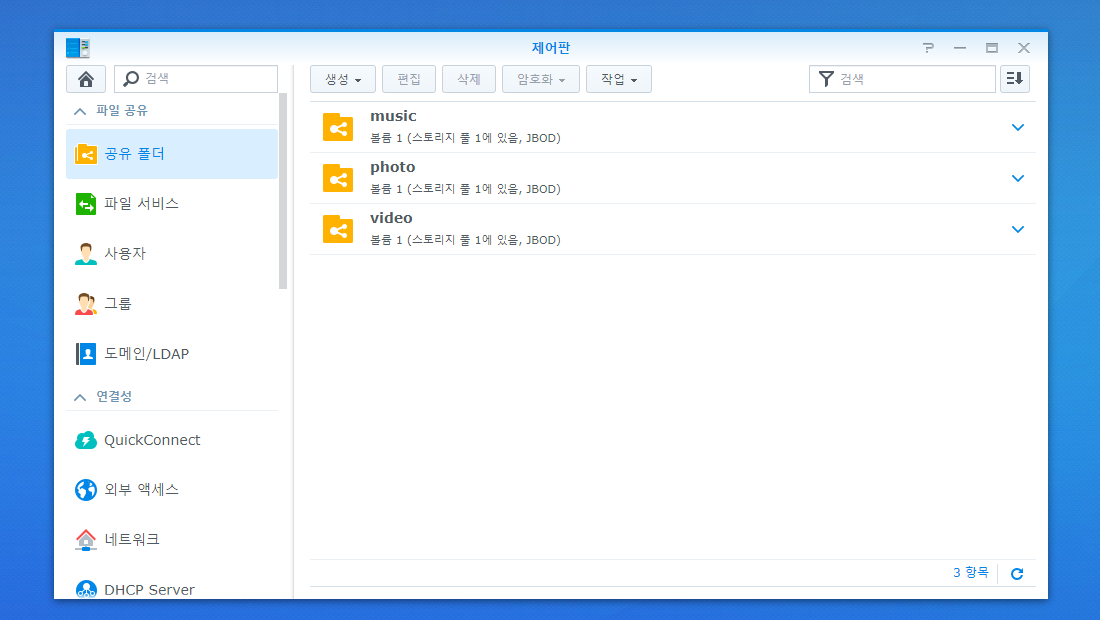 music, photo, video 공유폴더가 생성되어 있는 것을 확인 할 수 있습니다.