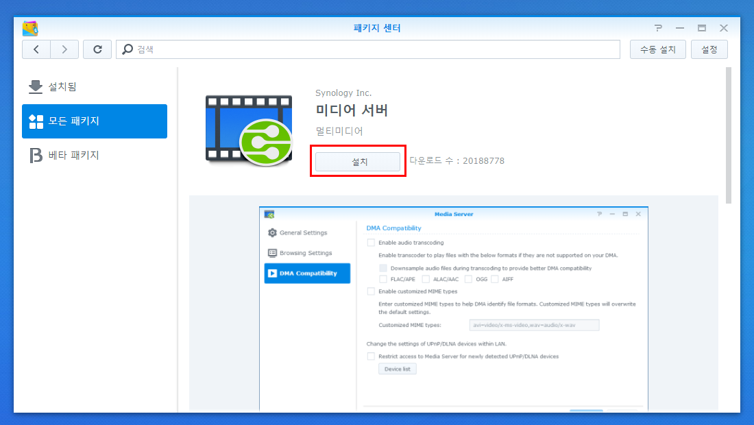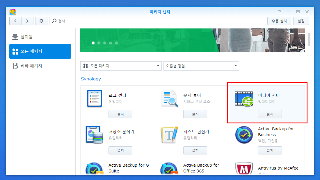 우선 패키지 센터를 열어 모든 패키지에서 미디어 서버를 찾아서 클릭해보자.
