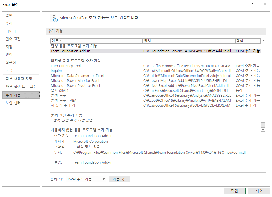 - 하단의 관리에서 COM 추가 기능을 선택하고 이동 버튼 클릭