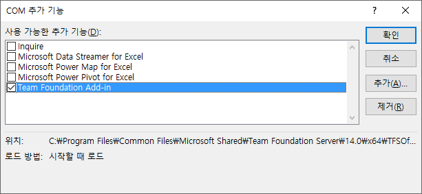여기서 Team Foundation Add-in이라는 것이 선택되어 있을 것입니다.