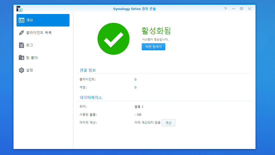 설치하고 열기 버튼을 클릭하거나 메인 메뉴에서 Synology Drive 관리 콘솔 아이콘을 클릭하시면 Synology Drive 관리 콘솔 화면을 보실 수 있습니다.