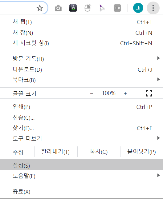 크롬 브라우저의 오른쪽 상단에 있는 ... 모양 버튼을 클릭하고 설정(S)을 클릭합니다.