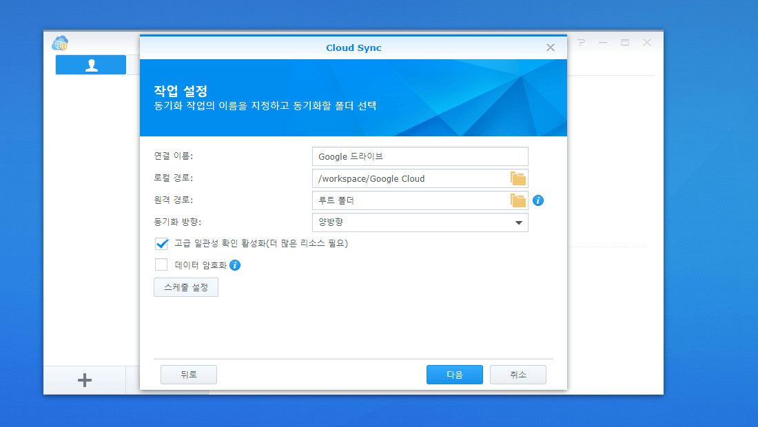 Google 드라이브가 시놀로지 Cloud Sync에 등록되면 목록에 아까 설정했던 연결 이름으로 동기화 목록에 추가됩니다.