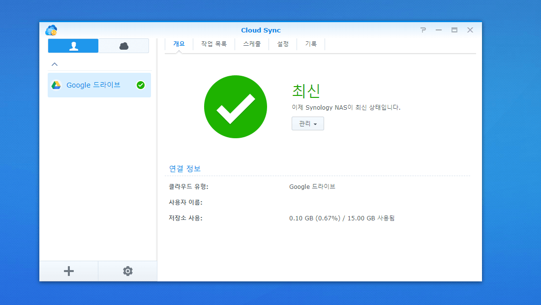 동기화의 현재 상태, 작업 목록, 스케줄, 설정, 기록 탭으로 동기화의 상태를 확인하고 설정을 수정할 수 있습니다.
