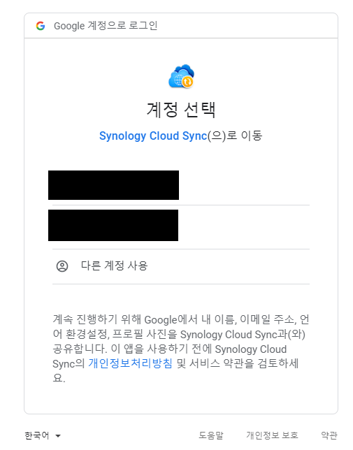 연동할 계정을 선택하면 Synology Cloud Sync에서 Google 계정에 접근 권한을 요청합니다.
