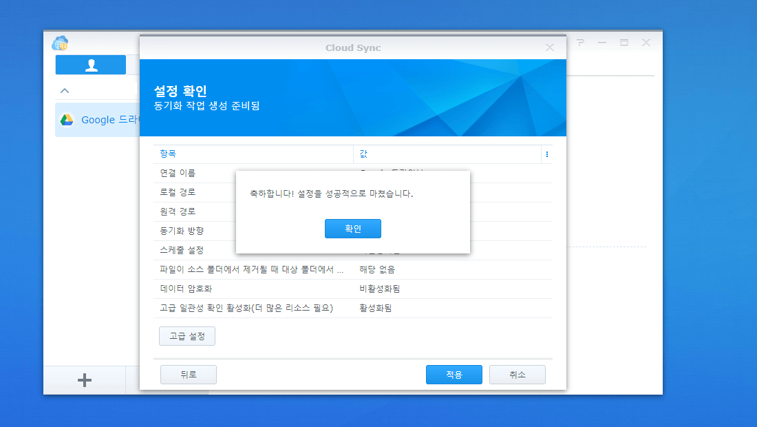 Google 드라이브가 시놀로지 Cloud Sync에 등록되면 목록에 아까 설정했던 연결 이름으로 동기화 목록에 추가됩니다.