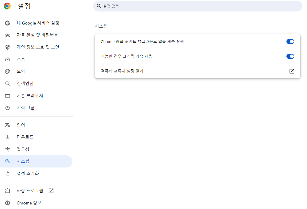 - '가능한 경우 하드웨어 가속 사용' 옵션을 끄고, 브라우저를 재시작합니다.