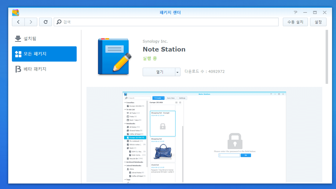 설치해서 실행해보시면 아래와 같이 Note Station의 화면이 나타나게 됩니다.