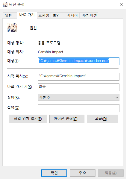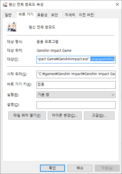 만든 원신 전체 창모드 바로가기 파일의 속성 창을 열어봅시다.