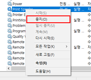 우리는 Print Spooler에서 문제가 생긴 것이기 때문에 서비스를 중지했다가 작업을 마치고 다시 서비스를 실행해야 합니다.