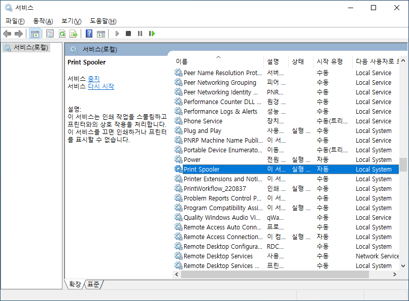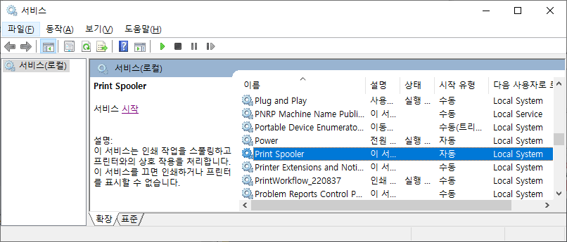 처음 실행했던 서비스 관리자에서 Print Spooler 서비스를 찾아가 다시 실행해 줘야 합니다.