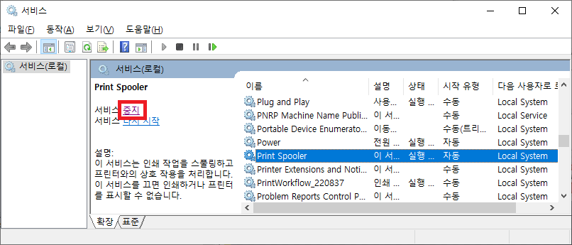 우리는 Print Spooler에서 문제가 생긴 것이기 때문에 서비스를 중지했다가 작업을 마치고 다시 서비스를 실행해야 합니다.