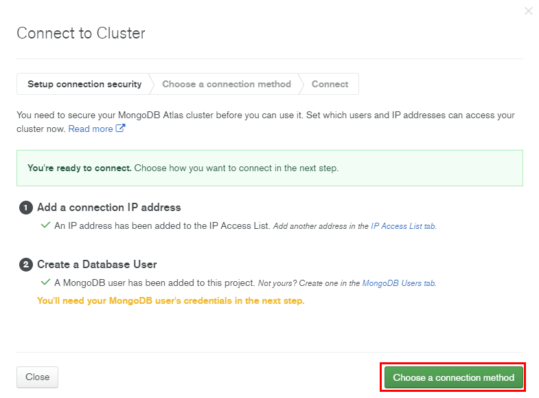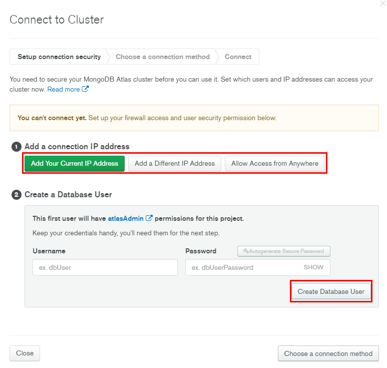 Add Your Current IP Address, Add a Different IP Address, Allow Access from Anywhere 중 본인에게 맞는 것을 선택해서 설정하시면 됩니다.