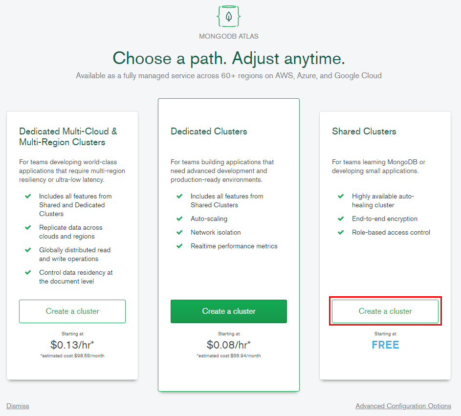 Continue 버튼을 클릭하고나면 요금제를 선택하라고 하는데 우리는 무료를 사용할 것이기 때문에 오른쪽 끝의 FREE라고 써져있는 Shared Clusters를 선택합니다.