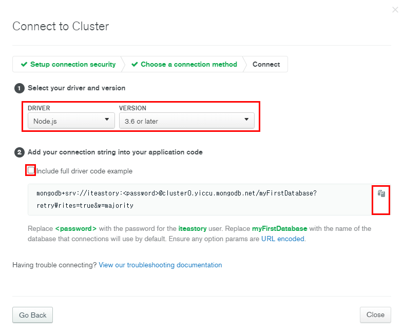 1번에서 Driver와 Version을 선택하면 거기에 맞는 코드를 제공해줍니다.