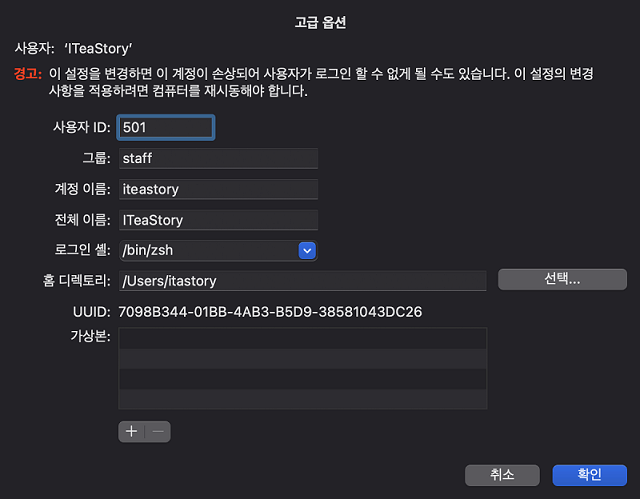 - 계정 이름(iteastory), 홈 디렉토리(/Users/iteastory)를 아까 바꿨던 홈 디렉토리 이름으로 변경 (공백 사용 금지)