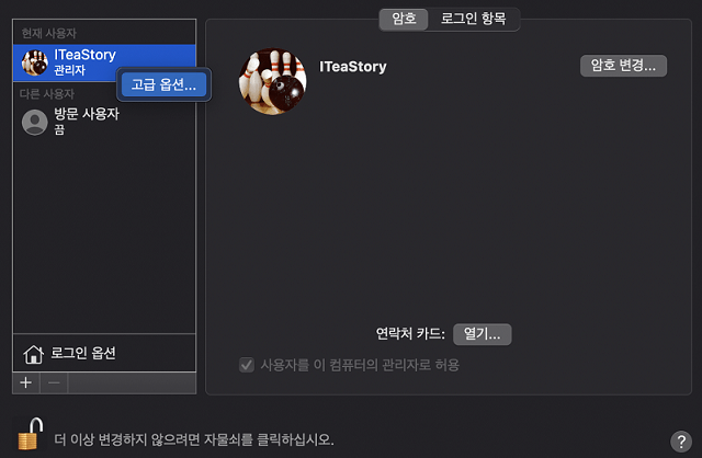 - 수정하고자 하는 사용자를 control + 클릭 후 고급 옵션 클릭