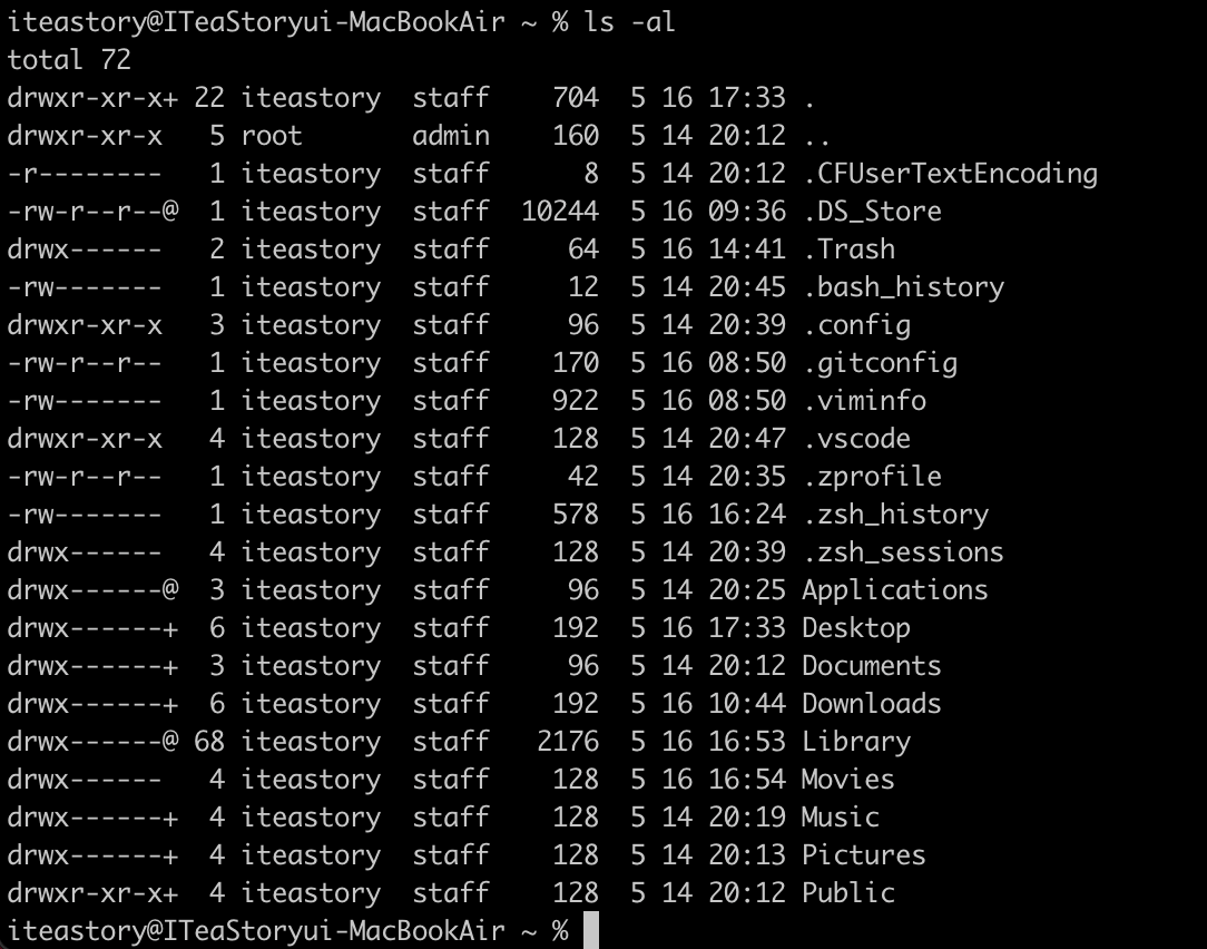 그리고 다시 위에서 썼던 ls -al로 확인해보면 .zshrc 파일이 생성되어 있을 거예요.