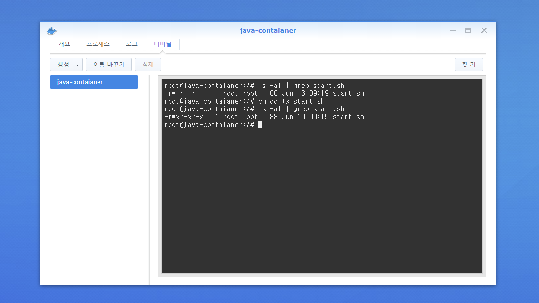 먼저 지난번에 만들었던 컨테이너의 터미널로 접속해 줍니다.