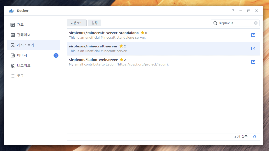 sirplexus를 찾아보면 아래 이미지처럼 3개의 Docker 이미지가 보일 건데 우린 가운데 있는 sirplexus/minecraft-server를 사용할 거예요.