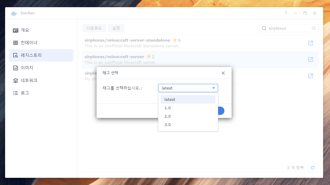 이걸로 설치할 이미지의 버전을 선택할 수 있는데 가장 최신 버전인 3.0을 선택해줬어요. 최신 버전을 사용하시려면 그냥 latest를 선택해도 되는데 나중에 내가 무슨 버전을 설치해놨는지 잊어버려서 전 버전을 따로 선택해줬어요.