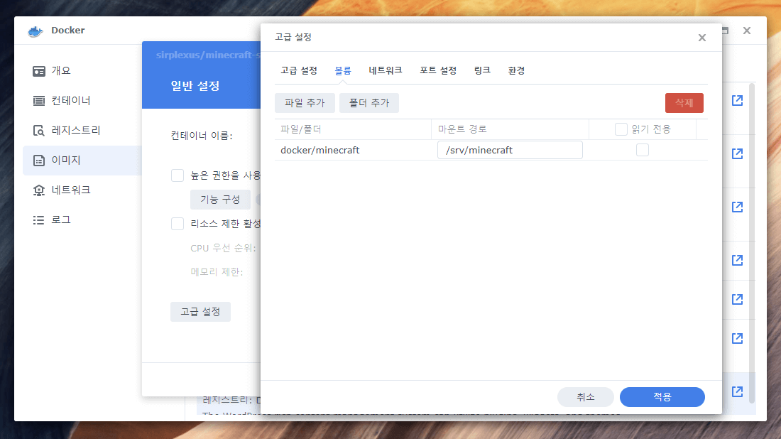 이렇게 하면 내 NAS의 docker/minecraft 폴더가 지금 만들고 있는 마인크래프트 서버를 가동할 컨테이너의 /srv/minecraft에 연결되는 거예요.