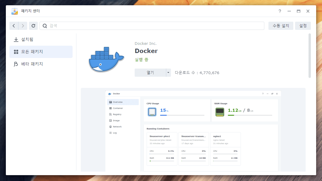 저는 이미 설치를 해둬서 버튼이 열기인데 설치 버튼이 보이시면 그냥 설치하시면 돼요. 시놀로지 장점이 쉽다는 거잖아요? 시키는 대로 클릭 몇 번만 하시면 설치가 완료될 거예요.