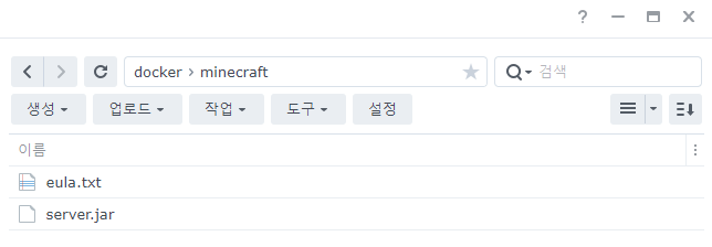 전 docker라는 이름의 공유폴더를 하나 만들고 그 밑에 minecraft라는 폴더를 하나 만들어서 거기에 마인크래프트 서버 파일과 eula.txt 파일을 추가해 줬어요.