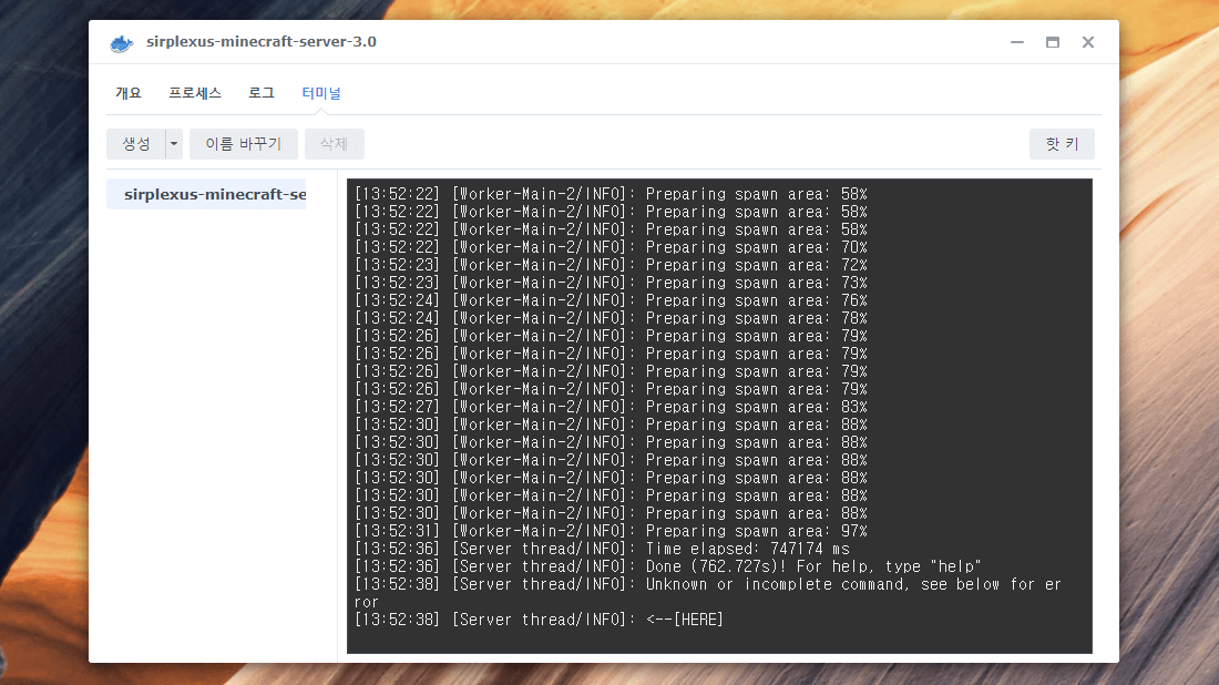 여기서 방금 생성했던 마인크래프트 서버가 실행되고 있는 것을 확인할 수 있지요.