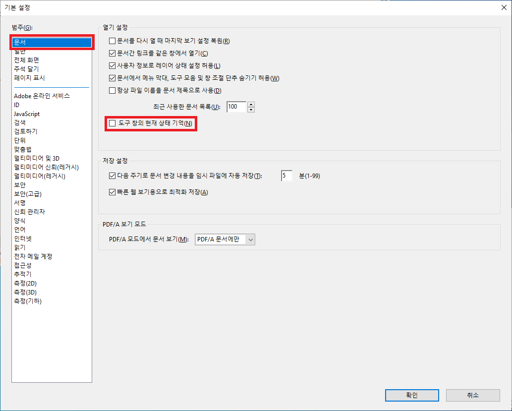 이 창의 왼쪽 범주에서 문서를 선택한 후 열기 설정에서 도구 창의 현재 상태 기억 부분에 체크를 해주세요.