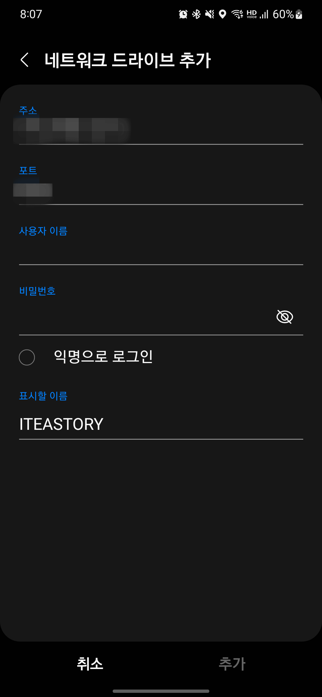 주소는 시놀로지 NAS가 사용 중인 사설 IP(예: 192.168.0.2)가 들어가 있을 거고 포트에는 따로 설정을 하지 않았다면 SMB의 Well-known Port인 445가 입력되어 있을 것입니다.