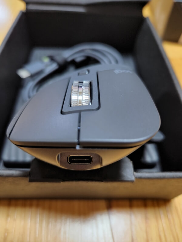 마우스 전면에 충전을 위한 USB type-C 포트가 있어요.