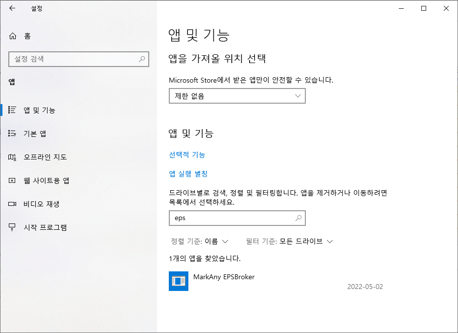 여기서 설치된 앱들을 조회하고 삭제할 수 있습니다. 드라이브별로 검색, 정렬 및 필터링합니다. 앱을 제거하거나 이동하려면 목록에서 선택하세요.라는 글 아래에 이 목록 검색이라는 검색 바가 보입니다. 여기에 삭제할 앱의 이름인 MarkAny EPSBroker를 입력하면 앱을 간단히 찾을 수 있습니다.
