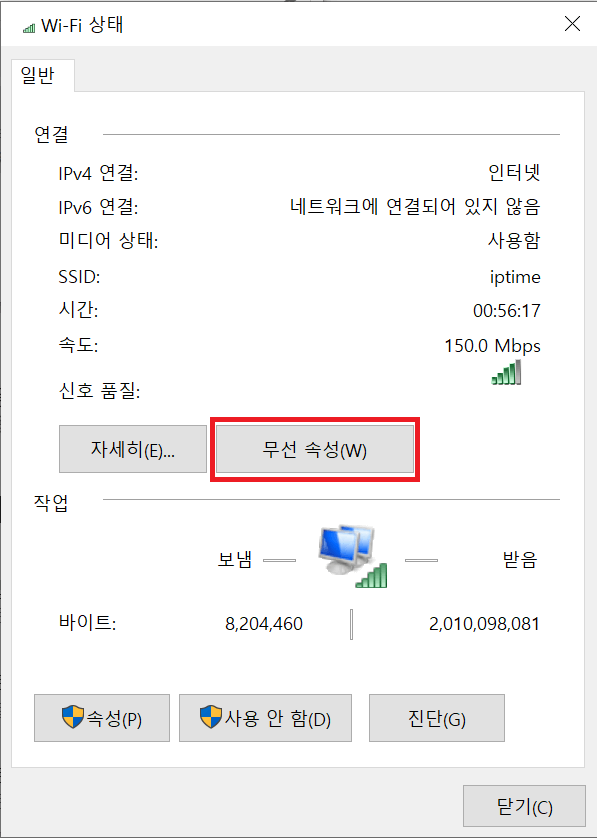 iptime 무선 네트워크 속성이라는 창이 뜹니다. 제 무선 네트워크의 이름이 iptime이라서 이렇게 뜨는 거니 다른 분들은 이 iptime 부분이 서로 다를 수 있습니다.