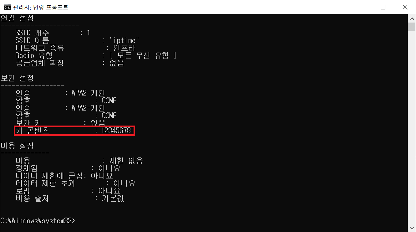 명령 프롬프트(cmd)를 관리자 권한으로 실행하지 않으면 여기서 키 콘텐츠가 있음으로 표시되고 실제 비밀번호를 보여주지 않아요. 그래서 관리자 권한으로 실행이 필요했던 것입니다.