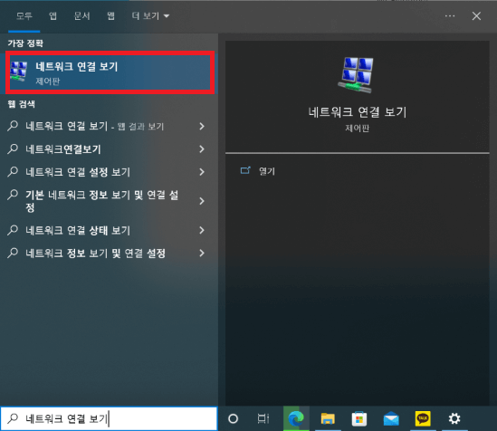 시작 메뉴에서 네트워크 연결 보기를 검색해보면 아래처럼 네트워크 연결 보기라는 제어판 항목을 찾을 수 있습니다.