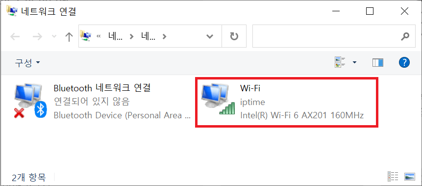 저는 Bluetoopth 네트워크 연결, Wi-Fi 두 개만 나오네요. 유선 네트워크 어댑터(LAN 카드)로 연결되어 있다면 그것도 여기에 보이게 됩니다.
