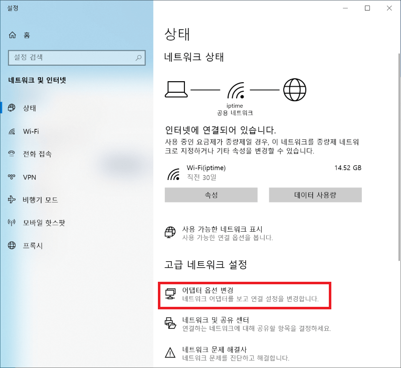 네트워크 및 인터넷 설정을 클릭해보면 아래와 같은 네트워크 상태 창이 나타납니다.