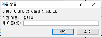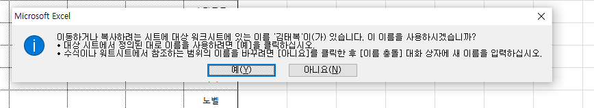 이렇게 한 후 다시 엑셀 시트를 복사해 보면 이름 충돌 메시지 없이 잘 복사될 것입니다.