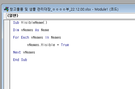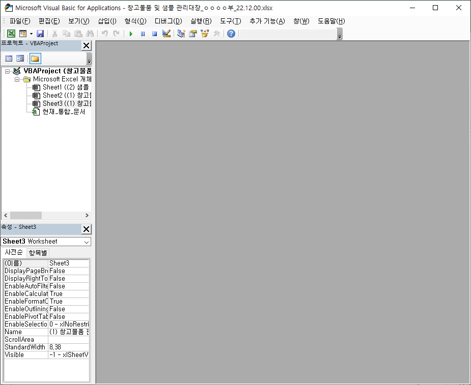 그럼 아래처럼 Microsoft Visual Basic for Applications라는 윈도우가 하나 나타납니다. 이 윈도우는 VBA이라는 엑셀 솔루션을 개발하기 위한 개발 도구인데 이 것을 사용해서 숨어서 보이지 않던 오류가 있는 이름을 찾아낼 예정입니다.