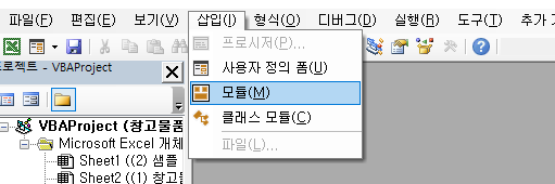 먼저 상단 메뉴바에서 삽입을 클릭해 줍니다. 그리고 하단을 보면 모듈(M)이 보입니다.. 이 모듈을 클릭해 줍니다.