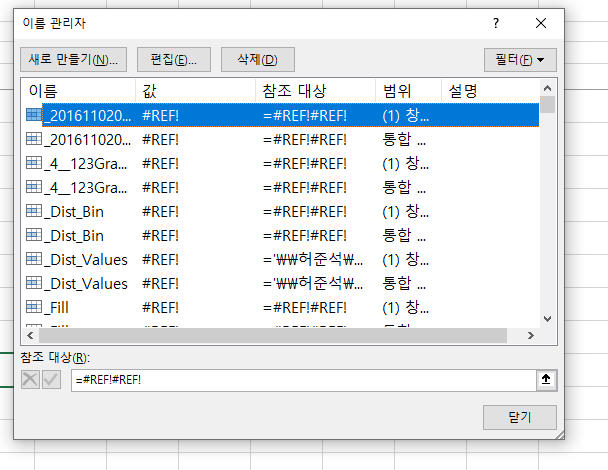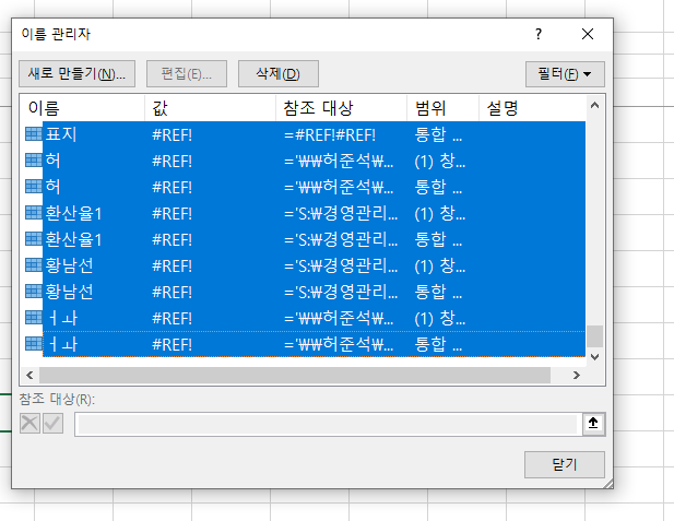 이름 관리자를 클릭해 봅시다. 그럼 아래처럼 이름 관리자 윈도우가 나타납니다. 자세히 보면 값에 #REF!라고 적힌 부분들이 보입니다. 값에도 있고 참조 대상에도 보이네요.