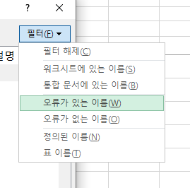 클릭해 보면 필터 관련 옵션들이 보입니다. 필터 해제, 워크시트에 있는 이름, 통합 문서에 있는 이름, 오류가 있는 이름, 오류가 없는 이름, 정의된 이름, 표 이름.