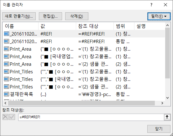 다시 아까 확인했던 수식의 이름 관리자를 실행해 봅시다. 이번에는 스크롤 바부터 심상치 않네요. 언듯 보기에도 #REF!가 엄청 많아 보입니다. 아까는 보이지 않던 숨어있던 이름들이 모두 나타나서 그렇습니다.
