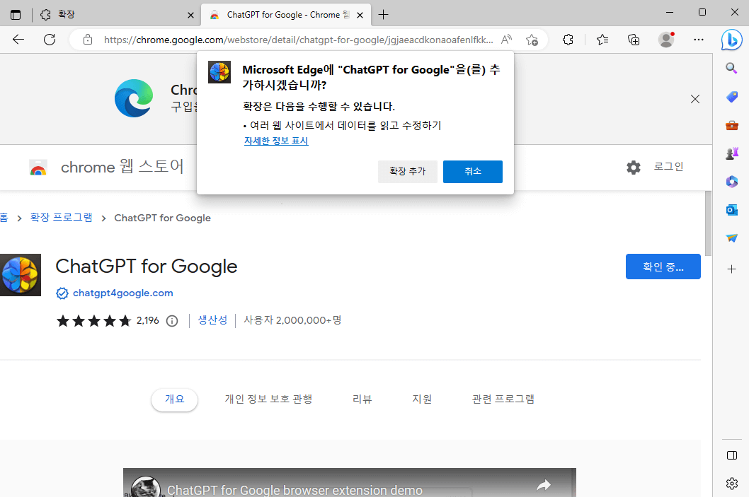 허용해주고 나면 이제 확장 프로그램을 추가할 것인지 묻는 화면인 나타납니다. Microsoft Edge에 "ChatGPT for Google"을(를) 추가하시겠습니까? 라며 추가 여부를 묻고 있습니다. 확장 추가 버튼을 클릭해 주면 이 확장 프로그램이 Edge에 설치되게 됩니다.