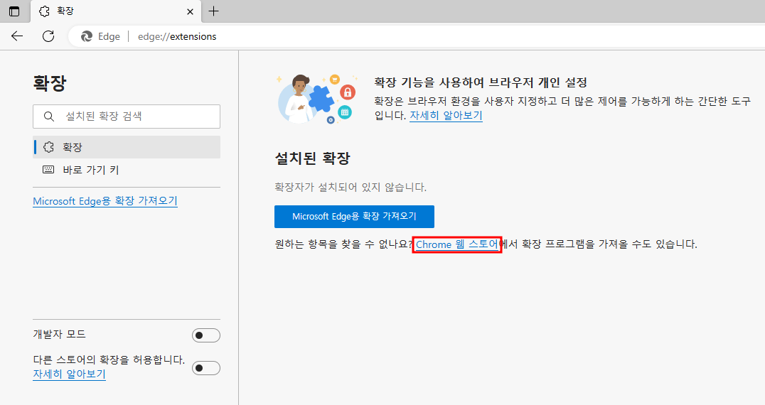 확장 관리 페이지의 좌측 화면을 보면 설치된 확장이라는 부분이 보입니다. Microsft Edge에서 설치된 플러그인을 관리할 수 있는 공간입니다. 아래쪽을 보면 Chrome 웹 스토어에서 확장 프로그램을 가져올 수도 있습니다.라는 글이 보입니다. Chrome 확장 프로그램을 설치하려면 이 Chrome 웹 스토어를 클릭하면 됩니다.