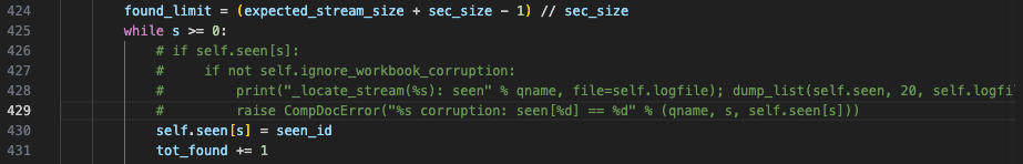 저는 Users/iteastory/dev/ChatGPT/.venv/lib/python3.11/site-packages/xlrd/compdoc.py입니다. 이 파일의 429로 가보면 아래와 같은 코드를 볼 수 있습니다. 이 부분을 수정해 줍니다.